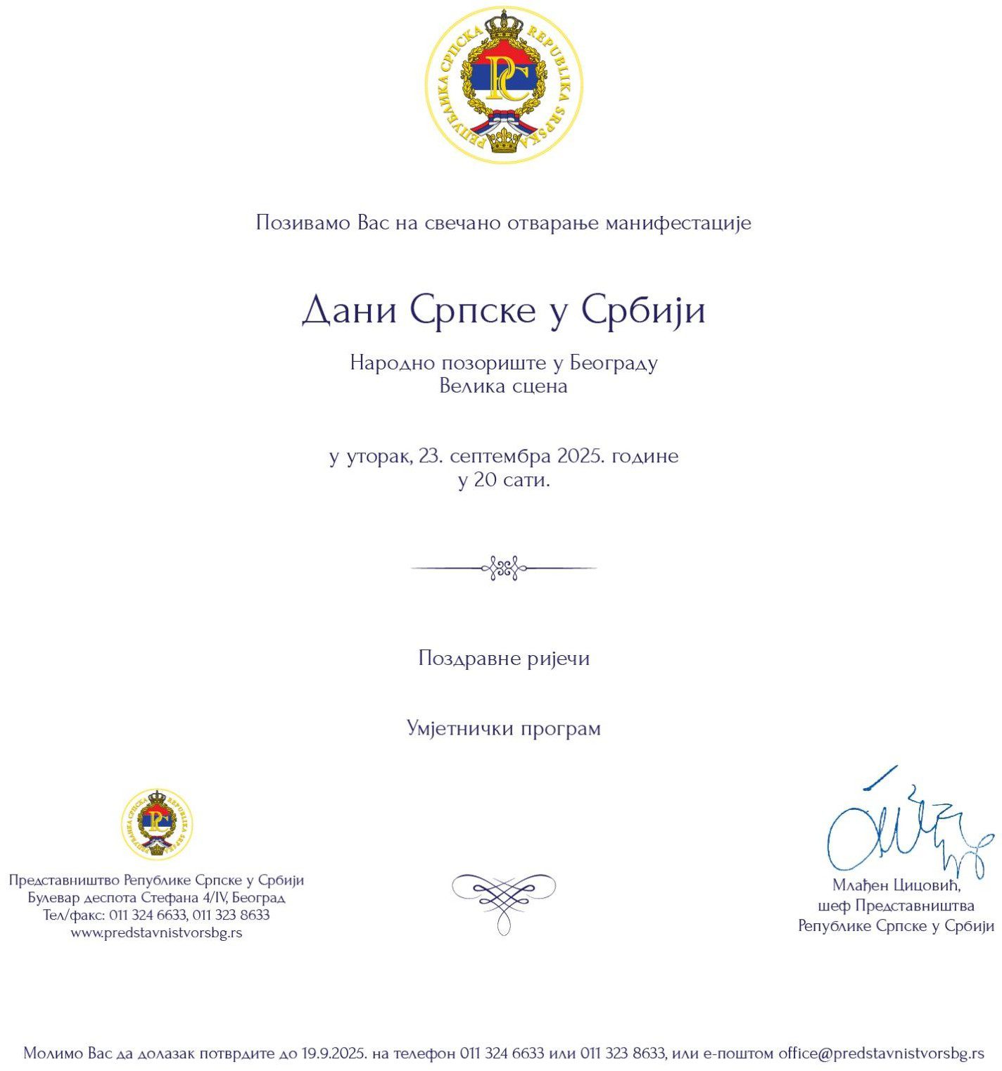 ПРИЈАВА ЗА ПРИСУСТВО МАНИФЕСТАЦИЈИ „ДАНИ СРПСКЕ У СРБИЈИ, 23.09.2025. НАРОДНО ПОЗОРИШТЕ