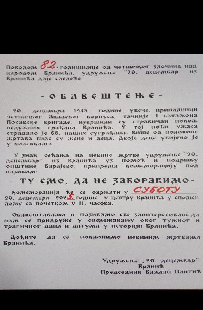 У Вранићу код Београда, на позив Удружења „20 децембар“ из Вранића, данас смо обележели 82-у годину од свирепог, да не може бити свирепији злочин, од стране припадника ЧЕТНИЧКОГ АВАЛСКОГ КОРПУСА, над 68 недужних становника, места Вранић! Тога дана, 20. децембра 1943. године, над 14 породица места Вранић извршен је „масакр – покољ“, за који се с правом може рећи, „ОПРОСТИТИ ДА – ЗАБОРАВИТИ НЕ“ и „НЕ ПОНОВИЛО СЕ“!