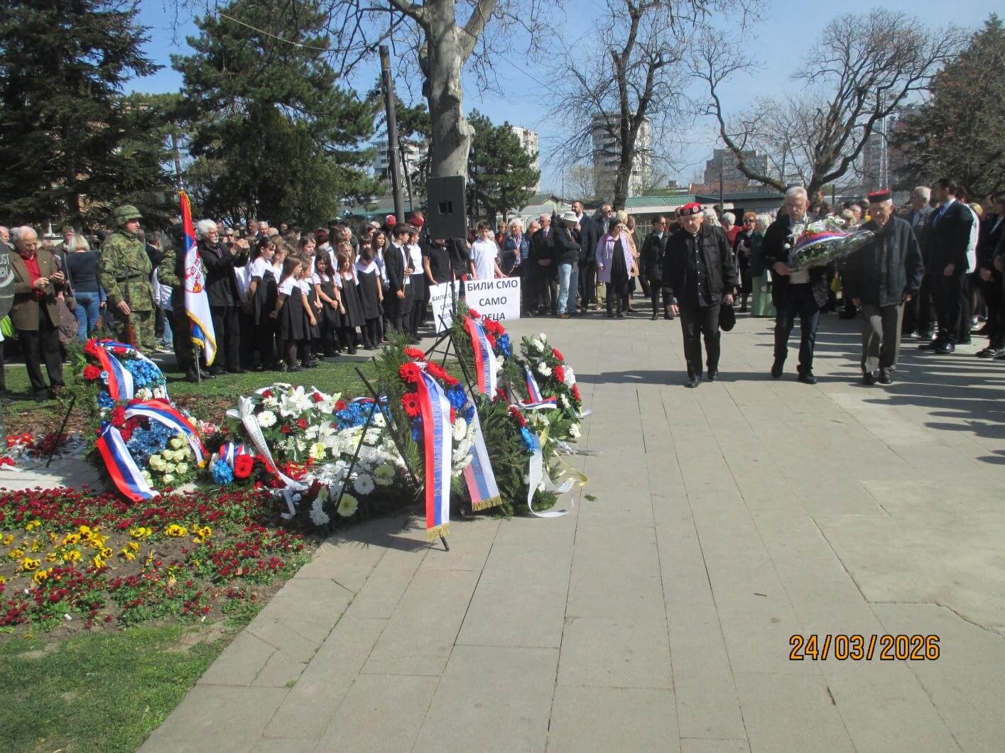 У оквиру државне церемоније, венце су положили министарка за рад, запошљавање, борачка и социјална питања Милица Ђурђевић Стаменковски, представници Војске Србије, Министарства унутрашњих послова, Весна Видовић, заменица градоначелника града Београда, као и многи представници Удружења који негују традиције ослободилачких ратова Србије, међу којима и 12 чланова/представника Удружења бораца 6. и 35. Личке дивизије…… СЊЕЖАНА МИХАЈЛОВИЋ, ВЕЉКО ЖИГИЋ, ДРАГАН СТЕВАНОВИЋ, МИЛИЦА ТОДОРИЋ, МИРЈАНА ЛАЛИЋ, ДУШАН СУРЛА, МАРИЈА ОБРАДОВИЋ, РАДОВАН ОБРАДОВИЋ, МИРКО БОШЊАК, МИРЈАНА ВУЊАК ЖИКИЋ, ВАСО ГЛИГОРЕВИЋ и ВЕЉО ГОГА, као и чланови породица страдалих у НАТО агресији.